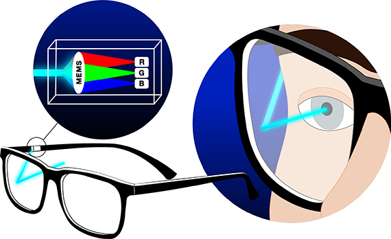 依照安装在眼镜框上的微机电系统 (MEMS) 微扫描器的指示,激光束通过瞳孔,并以不同角度投射到镜片上。镜片将光束聚焦在视网膜上,激光以极为细致的像素生成虚拟图像。因为只有一个激光束,显示系统可以做到很小。而且激光输出的功率也特别低,不会对眼睛造成任何伤害。