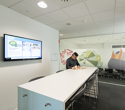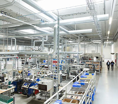 Ceiling-recessed Compact downlights with symmetric wide light distribution and Siteco Louvre Luminaire M luminaires (installed specifically for the standard-compliant lighting of VDU workstations) provide bright, pleasant light atmospheres in the offices and conference rooms. Corridors, hallways and stairways are also illuminated with Compact downlights. The Modario trunking system generates extremely uniform and highly reliable lighting with high visual comfort in the production areas. Modario trunking also has a modular concept that enables flexible, individual configurations. Intelligent DALI-based light control with motion- and daylight detection ensures light precisely according to needs and energy-efficient utilisation of light in the building.