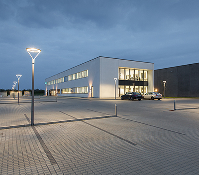 DL 20 outdoor luminaires support safe orientation near to the building and on parking lots, and SiCompact projectors mounted directly on the building facades provide further attractive orientation points for visitors and employees. These luminaires with horizontal light emission aperture feature a sophisticated optical system of lenses and photometric enclosure that minimises both glare and light spill.